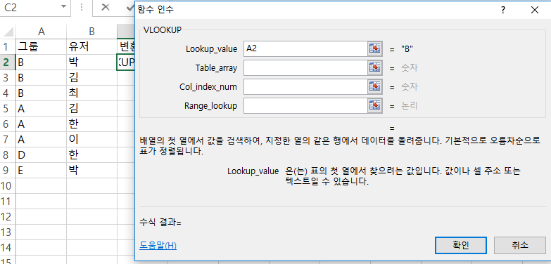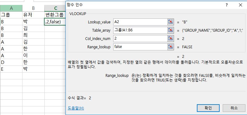VLOOKUP(입력값, 찾을 테이블 데이터, 찾을 테이블 데이터에서 사용할 열, 정확히 일치 할지 선택)