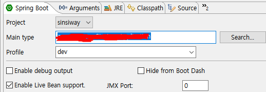 Run < Run Configurations 에 들어가서 Spring boot Profile 을 dev로 설정해 줍니다.